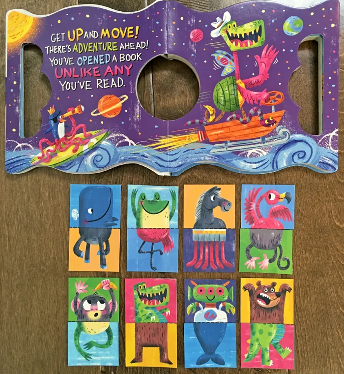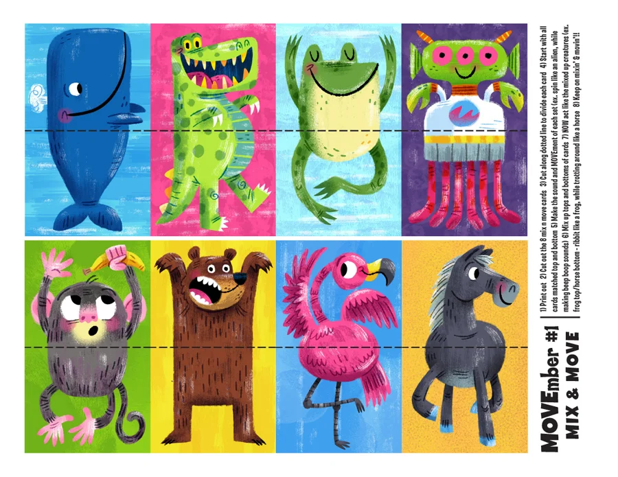 Are you ready to mix things up? We've brought together eight of the creatures from MOVE! to help us with a fun filled mix up activity (Can you find all 8 creatures as you read through MOVE!?) This activity will have you moving about and making silly sounds as you mix and match the creatures to create wacky new ones. For example, a ROARING dino may start out STOMPING around, but once he gets mixed with a GALLOPING horse ... LOOK OUT for a ROARING horse that gallops wildly across the range! Endless mix ups await, so let's get started! First you will need to download the activity page, print it and follow the instructions. (We recommend using card stock paper for durability).